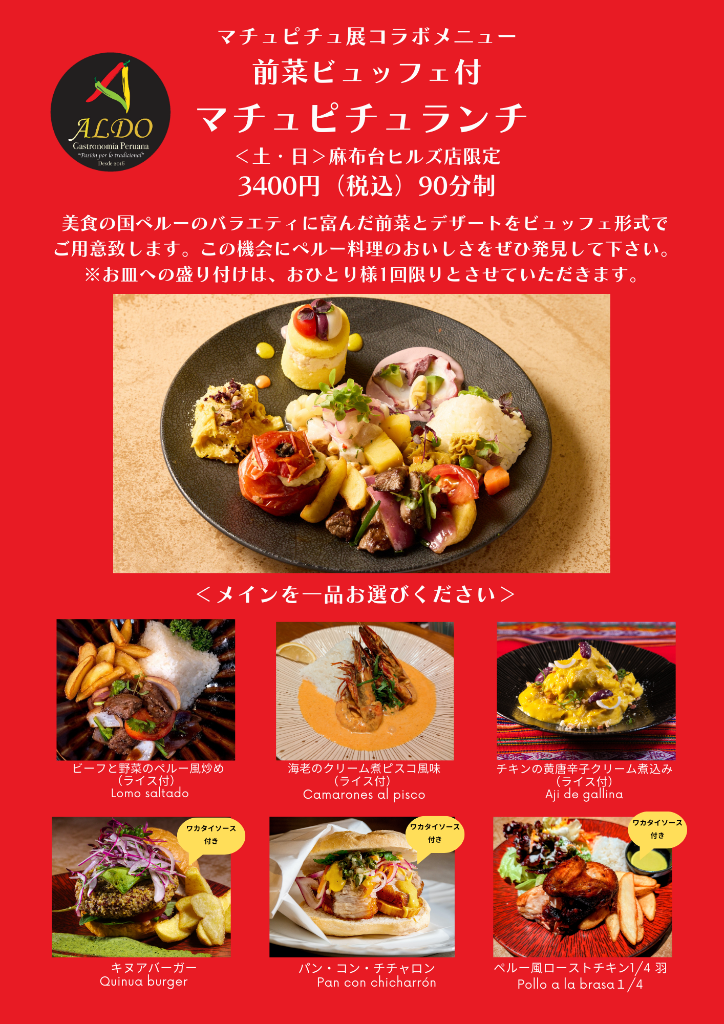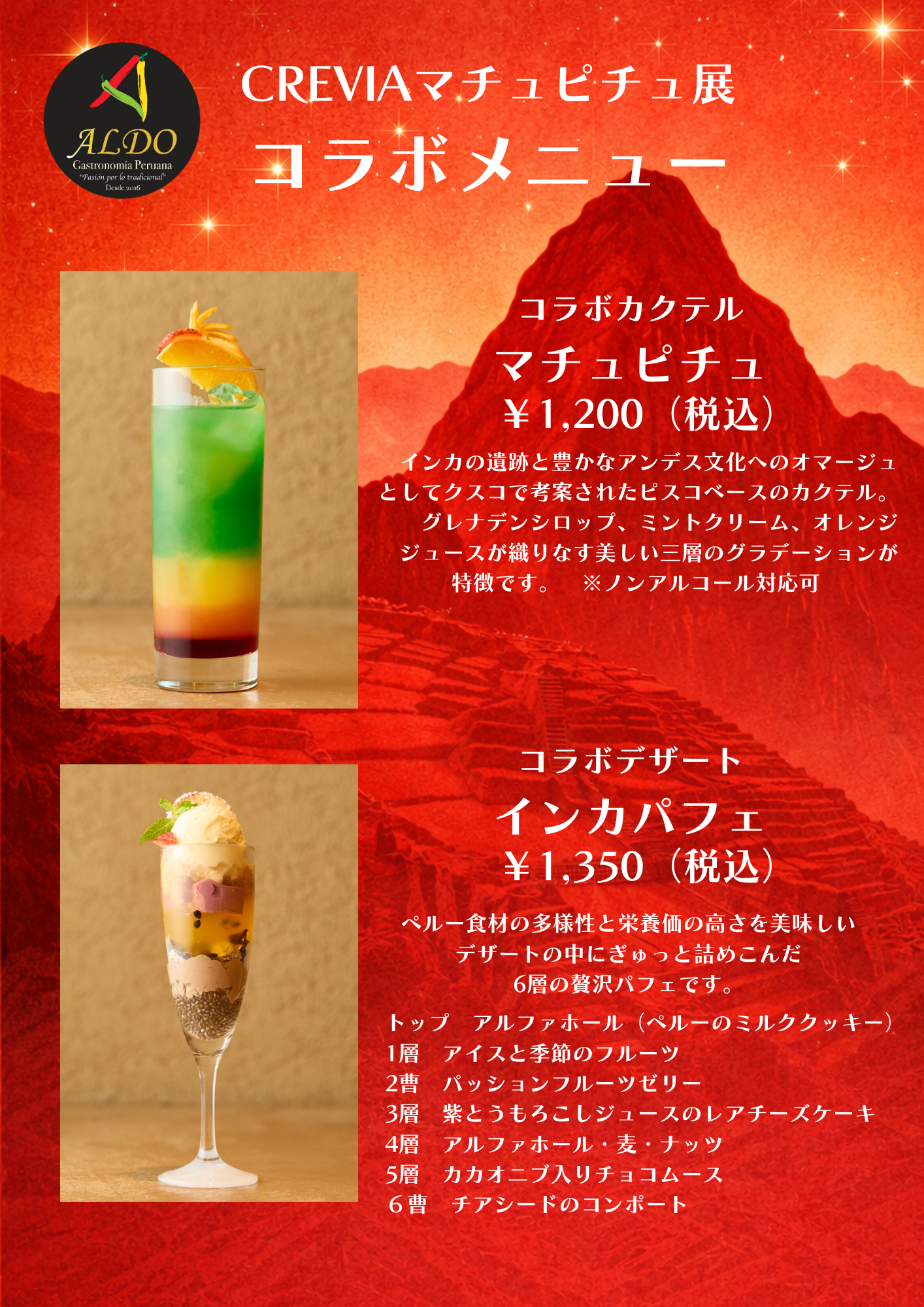 2025年11月22日から2026年3月1日まで森アーツセンターギャラリー(六本木ヒルズ森タワー)にて開催中の「CREVIAマチュピチュ展」とのコラボが決定いたしました。只今三種類のコラボメニューをご提供中!! 六本木ヒルズでマチュピチュとインカの壮大な歴史と文化に触れた後には麻布台ヒルズまで足を延ばしALDOで本格的ペルー料理をお楽しみください。